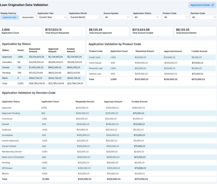 The new dashboard gives users deeper trust in their loan origination data. Similar to the Data Validation dashboard used for the cores, the Loan Origination Data Validation dashboard is a valuable part of the adoption of the loan origination domain within the Rise Analytics User Portal.