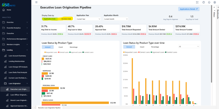 Previously, the loan origination dashboards were only based on the Decision Process Date and displayed a pipeline view only. Bases on user feedback, the dashboards were enhanced to leverage the Application Date or Decision Date of the loan applications.