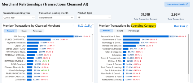 Transaction Enriched AI subscribers will have an updated version of all three dashboards that will include a filter for Payroll Transaction Flag. The updated filter on the dashboards, along with a filter and new column on the underlying TRANSACTIONS grid, gives credit unions the power to deep dive into all the payroll transactions flowing into the credit union.