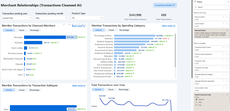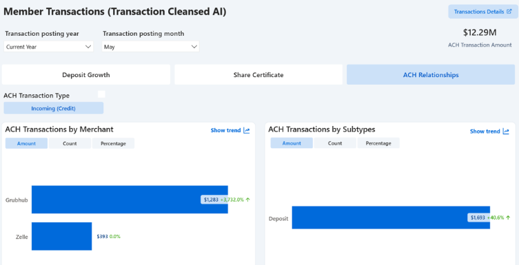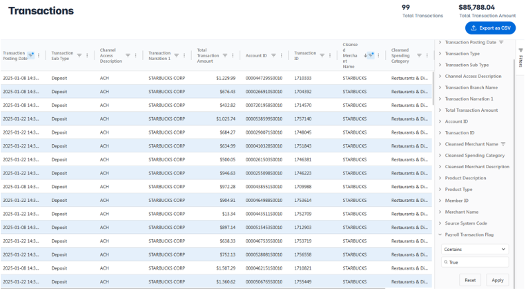 Identifying where a credit union member is employed is critical for knowing your members more deeply. It is also an important part of many credit union programs (i.e. deposit account bonuses for switching payroll to the credit union). Through the power of Transaction Enriched AI, credit unions are now able to track whether each transaction is part of a member's payroll. The following dashboards have been updated to include the Payroll Transaction Flag: